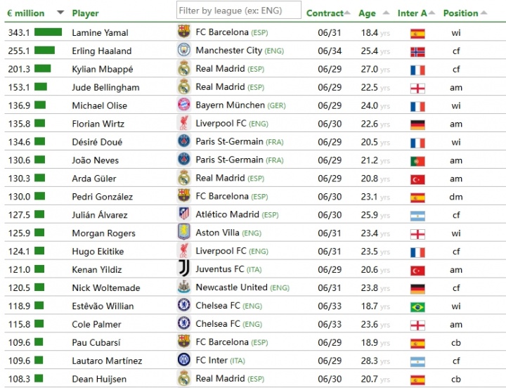 体育数据-CIES转会价值排名:亚马尔3.43亿第一,哈兰德2.55亿,姆巴佩2亿